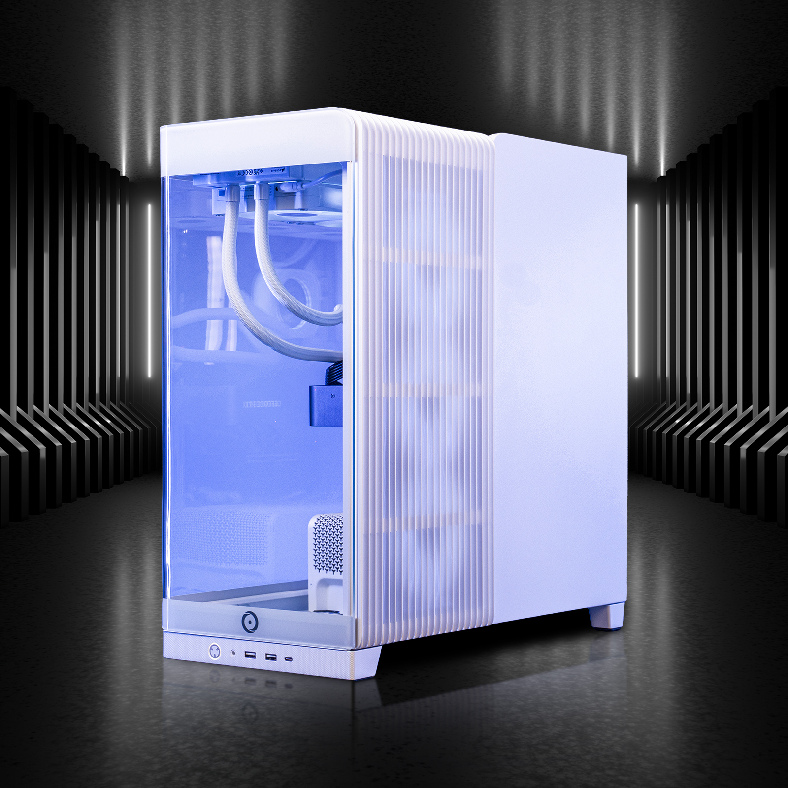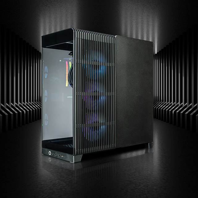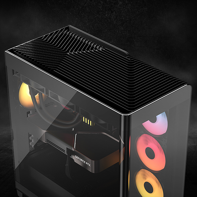 A panoramic glass panel made from a single piece of glass wraps around the front and sides for an unobstructed view of the hardware inside. The ventilated top and back panel feature a "waterfall" design for a unique look and enhanced airflow for side-and-top mounted fans.